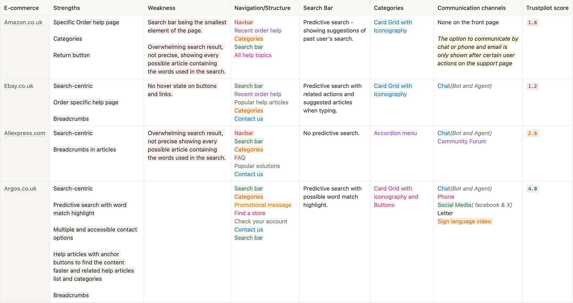 A benchmark study was conducted to identify best practices and trends utilized by leading e-commerce platforms in the British and global markets. The study focused on analyzing the support pages of three main competitors, evaluating their structure, navigation, communication channels, features, strengths, and weaknesses.