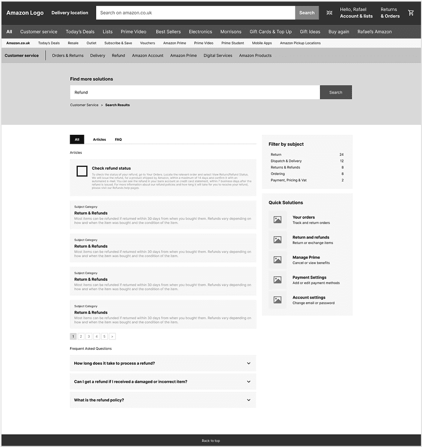 Personalized content adds a friendly tone, while the latest orders section in the front helps users quickly navigate order-related issues. Clear categorization, supported by relevant icons, enhances usability. However, the “All help topics” section falls short, presenting too much information and making it harder for users to identify relevant topics efficiently.