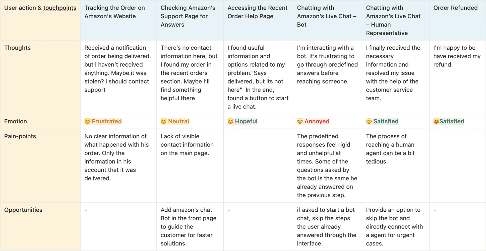 These pain points, with dissatisfaction over the effectiveness of Amazon’s support page and customer service, highlights areas where users frequently encounter barriers. This data provides a clear understanding of the user difficulty with the current support process and sets the stage for further investigation into these recurring issues.