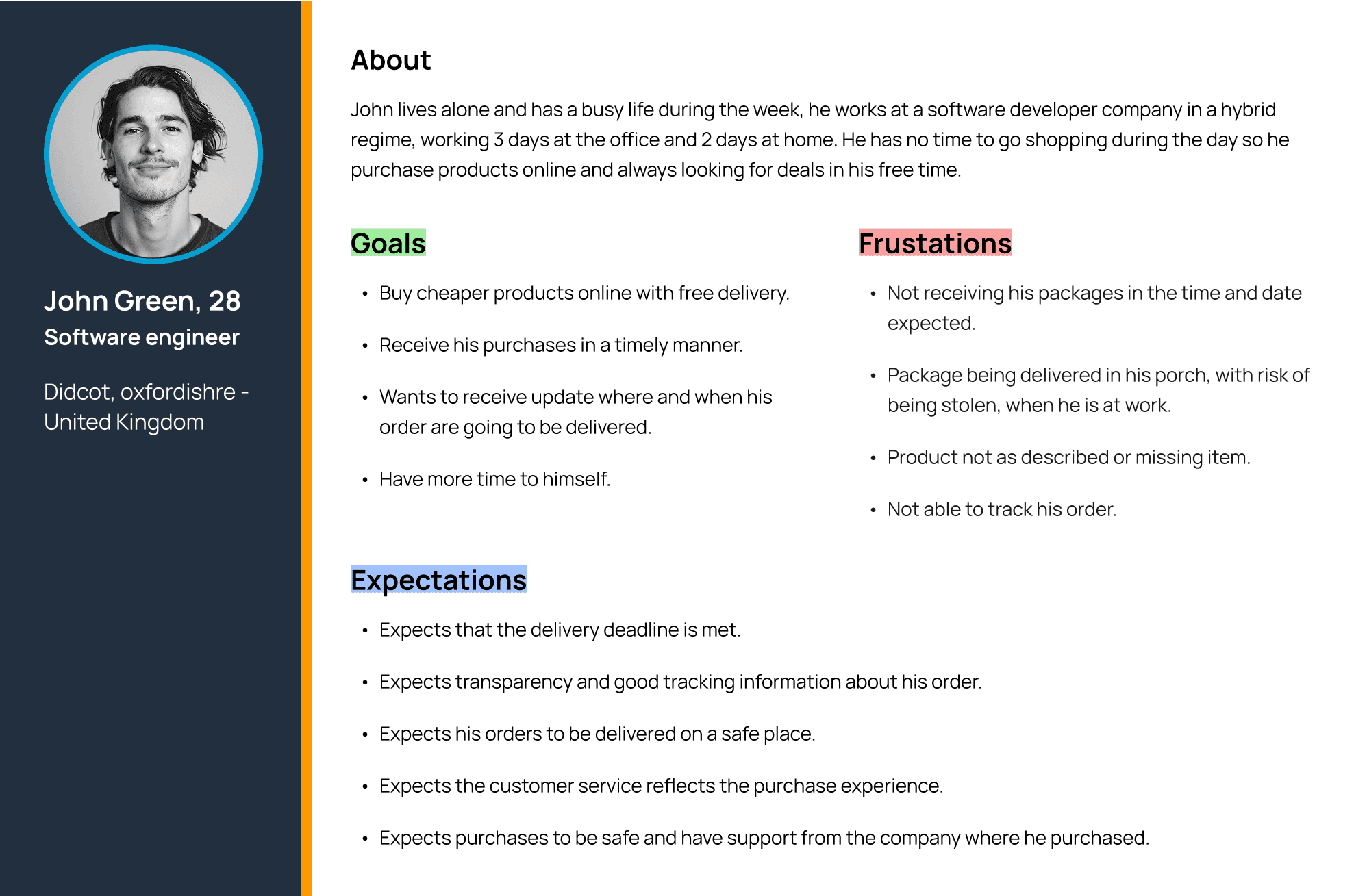 Based on the insights and demographic data gathered during the user research, a persona can be created using factual evidence. This persona serves as a representative model of the Amazon’s user base, offering insights about user behavior, goals, frustrations and expectations.