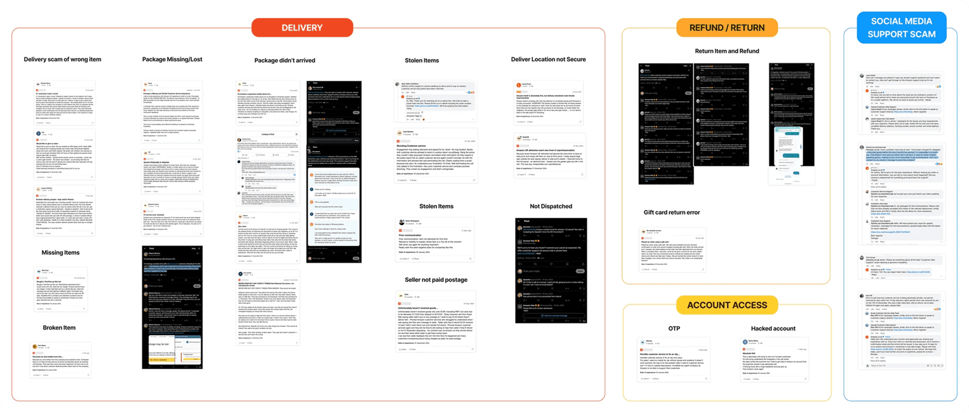 Data was gathered from recent complaints, messages, and posts from social media platforms such as Facebook and X, as well as the latest reviews and complaints on Trustpilot.com. Notably Amazon.com or Amazon.co.uk does not respond to Trustpilot reviews, and no official account appears to manage inside the platform.