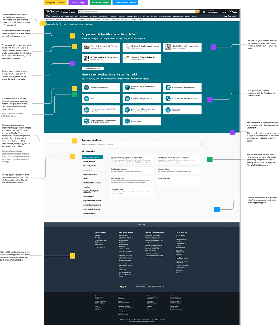 To further understand how the current amazon’s support page works, a usability and visual analysis was done. The analysis was divided in 4 main categories, Navigation/Structure, Visual design, Information/Content and Communication Channels. The main focus been in layout, readability, user experience, visual elements, information content and communication.